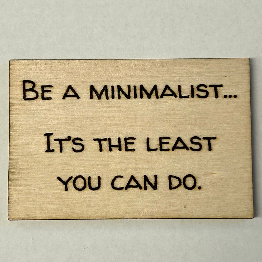 "Be a minimalist...It's the least you can do." Unique funny laser engraved wood magnet. Made from basal wood with a laser engraved sentiment and/or image.