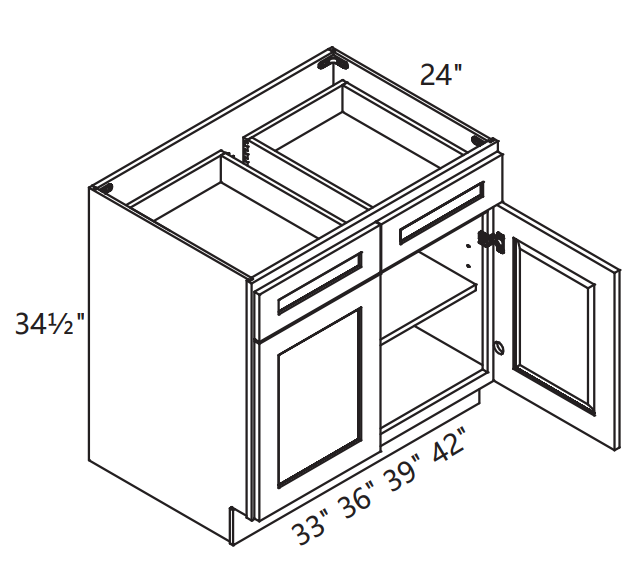 Classic Shaker Style double door with 2 drawers base cabinet. Dimensions for cabinet are 33" wide by 24" in depth x 34 1/2" in height. Select both color and width for pricing.