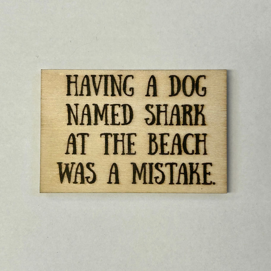 "Having a dog named Shark at the beach was a mistake." Unique funny laser engraved wood magnet. Made from basal wood with a laser engraved sentiment and/or image.