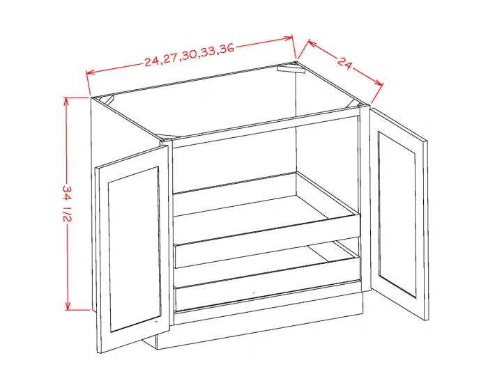 Dimensions are 24" to 36" wide by 24" in depth and 34.5" in height. Full height double door double rollout shelf base.