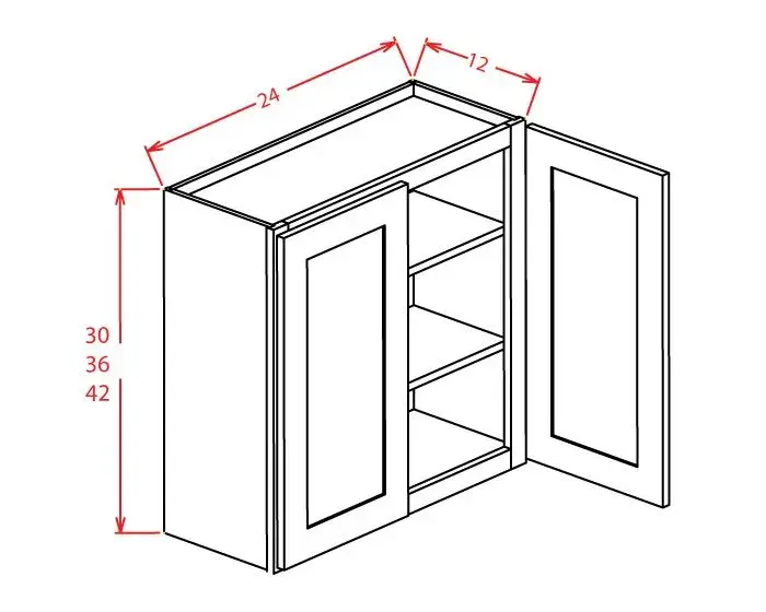 Dimensions are 24" wide by 12" in depth and 30" to 42" in height. Open Frame Wall Cabinet Double Door. (Does not include glass).