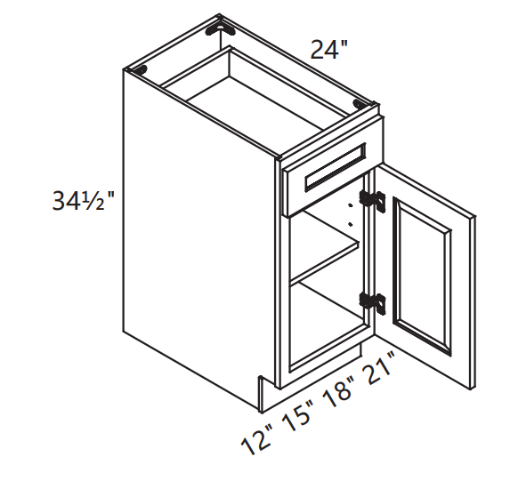 Classic Shaker Style single door with drawer cabinet. Dimensions are 12" wide by 24" in depth and 34 1/2" in height. Select color for pricing.