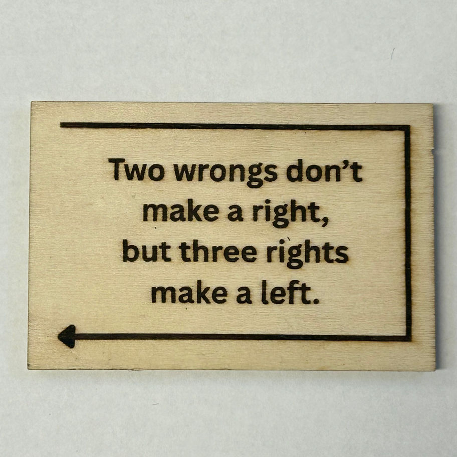 "Two wrongs don't make a right, but three rights make a left." Unique funny laser engraved wood magnet. Made from basal wood with a laser engraved sentiment and/or image.